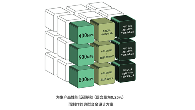 对于 400 Mpa,铌可单独使用,但对 500MPa 和 600MPa 级钢筋而言,将铌与不同微合金化元素搭配使用将带来非凡成效。例如,在生产直径达 30 mm、碳含量为 0.20-0.25% 的钢筋中,工业生产已证明单独使用铌或与其他微合金化元素一起使用可实现不同强度水平的成本效益。